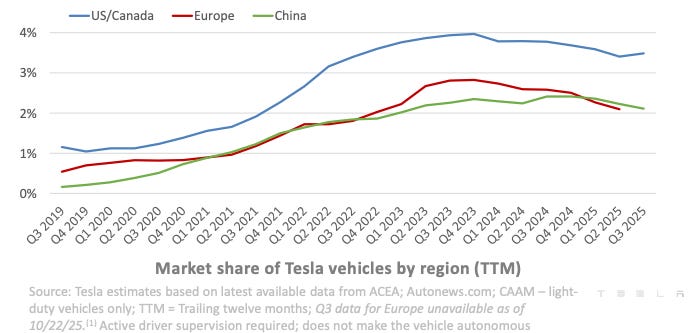 🌍 Market share: After years of expansion, Tesla is steadily declining across all regions. The visual in Tesla’s deck shows a worrisome trailing 12-month view. The US/Canada rebound is likely a “mirage” from the EV tax credit deadline pulling demand forward.