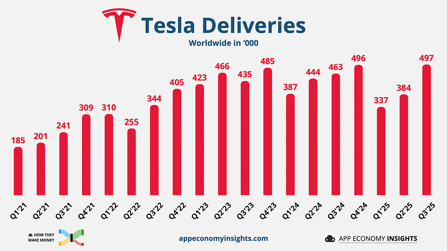 Tesla’s Q3 headline looks impressive with 497K deliveries, a sharp rebound that shows the EV pioneer can still move units.