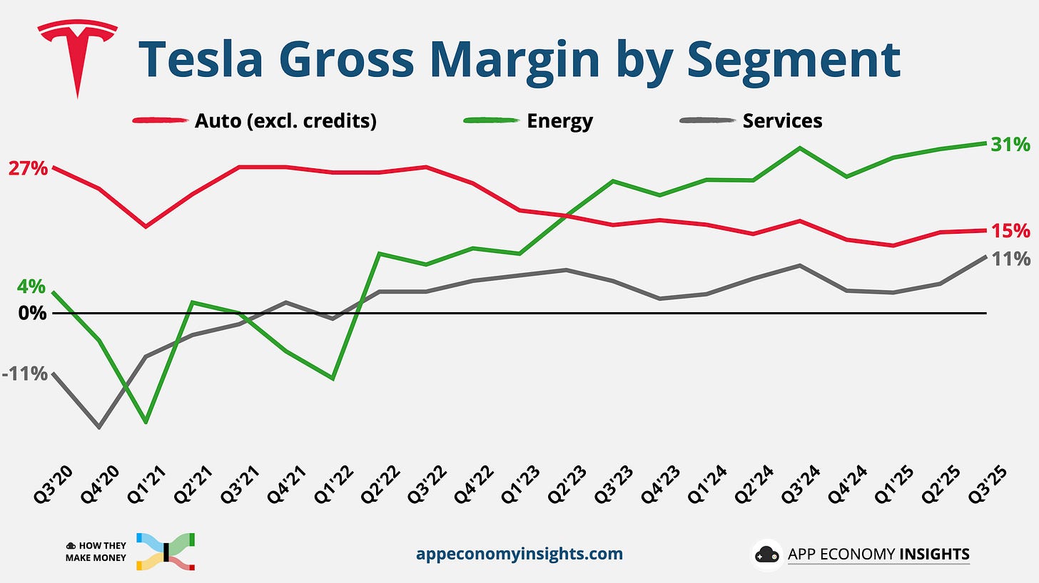 Segment performance tells the real story. The non-auto segments were up 33%, driving most of the growth. They represented 28% of Tesla’s gross profit.