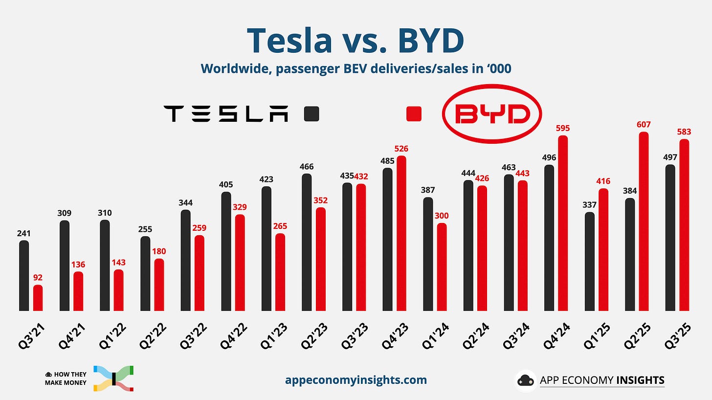 🥊 BYD showdown: BYD’s battery EV deliveries surged 32% Y/Y to 583K, widening its lead over Tesla for the fourth consecutive quarter. While it’s not a perfect comparison (BYD deliveries are not direct-to-consumer), the trend clearly tells a story.