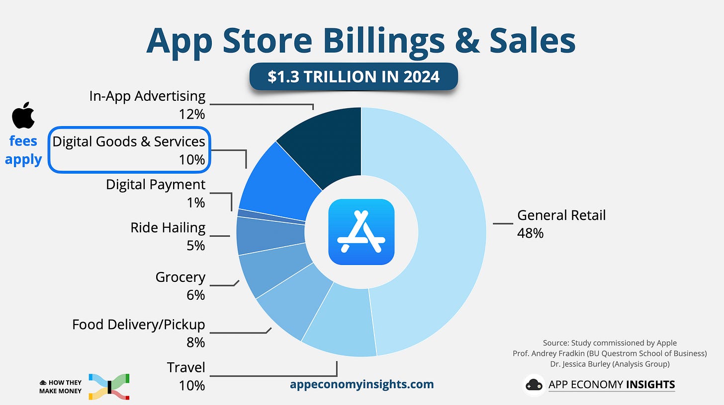 The remaining slice, digital goods and subscriptions, where Apple does take a cut, still brought in ~$130 billion. And that slice is under fire.