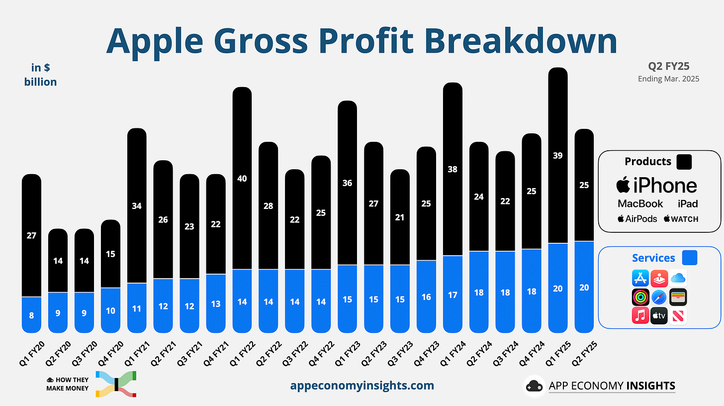 But it's not just about the top line. Every dollar received from Services generates more than twice the gross profit of Products. As a result, Services accounted for a substantial 42% of Apple’s gross profit in FY24, making it a key engine of profitability.