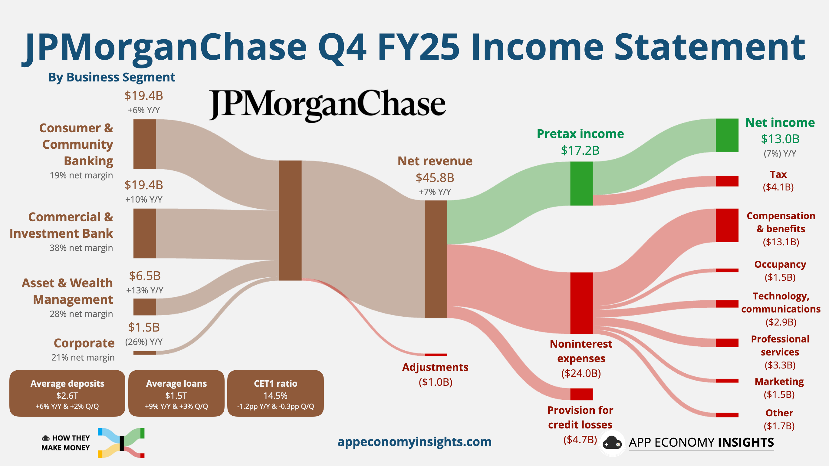 📊 Trading saves the quarter: While many peers struggled, JPMorgan's Markets revenue surged 17% to $9.7 billion, beating the highest analyst estimates. The beat was driven by a 40% jump in equities trading and strong fixed-income results, capitalizing on market volatility.