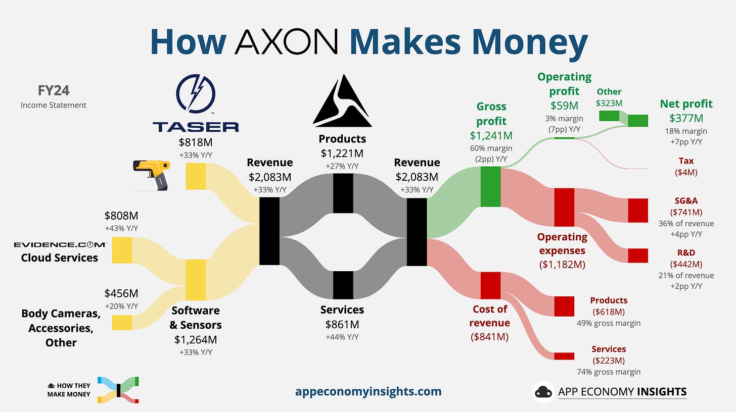 If this looks like Appleâs income statement, thatâs no coincidenceâAxon is following a similar playbook, a hybrid of hardware grit and software savvy. Today, the business splits cleanly into two segments: