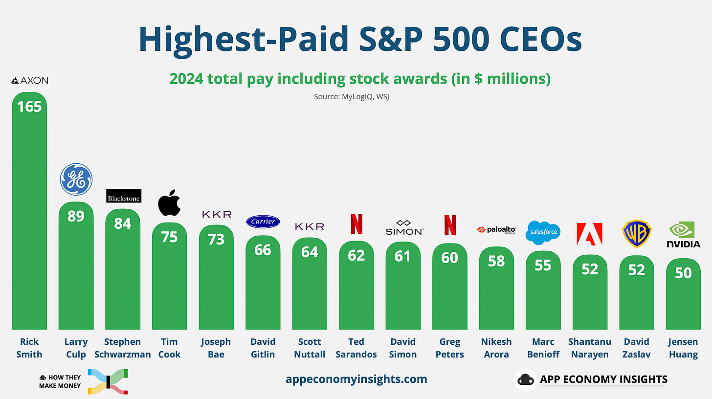 Rick Smith, co-founder and CEO of Axon, raked in $165 million in 2024âover three times what NVIDIAâs Jensen Huang earned.